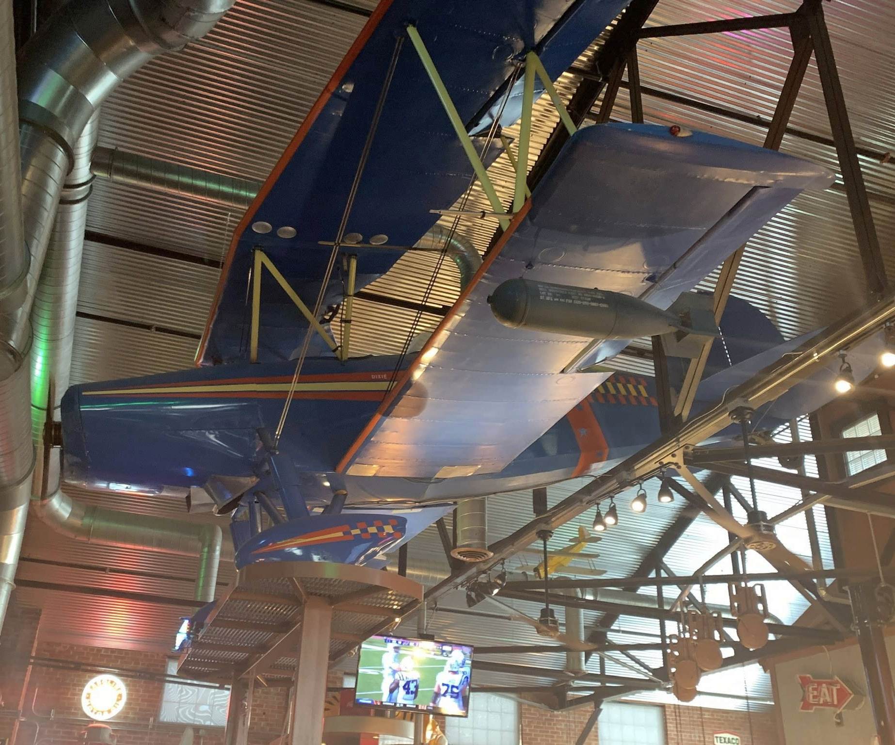 A 2025 photo of an unidentified biplane mounted inside The Hangar, the bar which occupies the former Wardwell Field hangar.